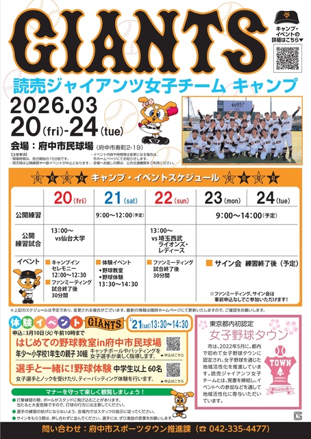 市内を活動拠点とする読売ジャイアンツ女子チームが、府中市民球場でキャンプを実施する。公開練習試合や選手との交流イベント、体験イベントも行われる。※体験イベントは3月10日に申込終了。