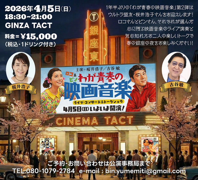 出演は、古谷敏、桜井浩子、グレース美香、早川優(司会)。演奏は、5 SPECIAL。「ローマの休日」「禁じられた遊び」「アイドルを探せ」「シェルブールの雨傘」他。ロコ(桜井浩子)さんとビン(古谷敏)さん、それぞれが選んだ心に残る映画音楽のライブ演奏と気心知れた二人の楽しいトークで素敵な春の銀座の夜を楽しもう! #桜井浩子 #古谷敏 #ウルトラマン