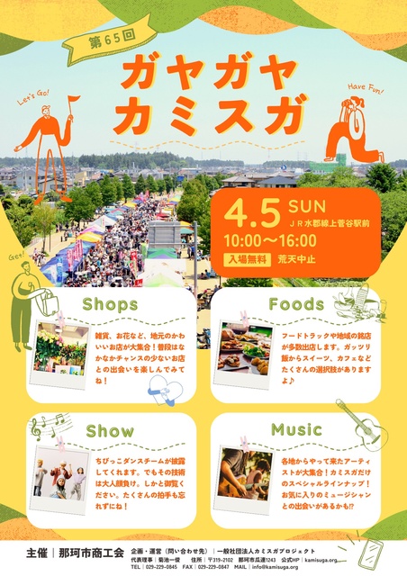 第65回ガヤガヤ☆カミスガは、年に一度のお花見商店街。桜並木をバックに歩行者天国のカミスガ商店街では、車両展示や約60店のテントやキッチンカーが並ぶ。揚物の良い匂いに誘われ舌鼓をうち、健康チェック、癒し体験、ショッピング。老若男女問わず、一日中春の良き日を楽しく過ごせる。また、ダンスや音楽が楽しめるキッズステージ、毎回アーティストに癒されるトラックステージ、戦豆の猿回しも大好評につき、見逃せない。