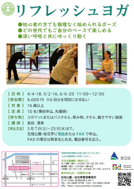 はじめてでも、体が硬くても、年齢を問わずだれでも参加できる初心者向けのヨガ。日本庭園を眺められる和室で、平日の疲れをリセットしてはいかが? 要事前申込(3月7日から25日まで)。花畑公園・桜花亭管理事務所に電話またはオンラインにて。
