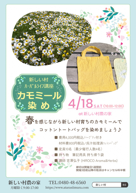 「Spring has come」春の訪れを感じる心地よい空間の中で、新しい村育ちのカモミールを使ってコットントートバッグを染めよう!