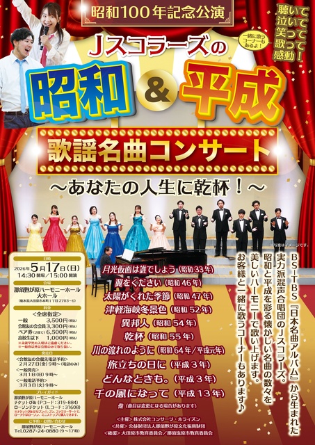 BS-TBS『日本名曲アルバム』から生まれた実力派合唱団のJスコラーズ。 懐かしい名曲の数々を美しいハーモニーで歌い上げる。会場の皆で一緒に歌うコーナーもあり。出演は、ピアノ:榎本潤、混声合唱:Jスコラーズ。予定曲目は、異邦人、川の流れのように、旅立ちの日に、ほか。※入場は小学生以上
