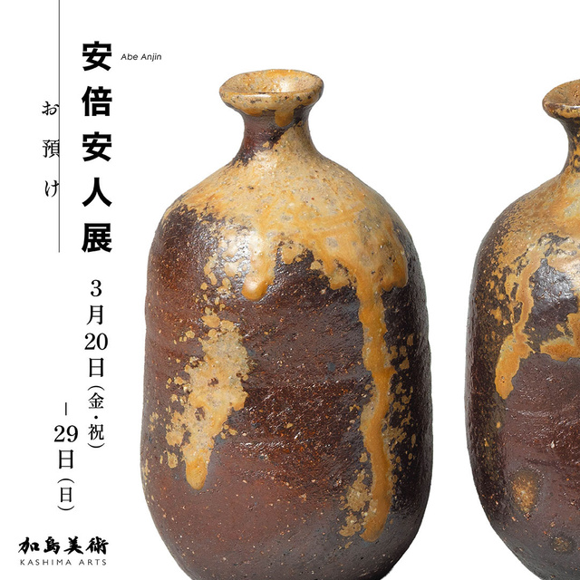 今展では、加島美術にて開催する安倍安人展では初となる、茶事において亭主の代役を務め、客同士の語らいをもたらす道具「お預け徳利」を出品。また桃山古備前への深い洞察に基づく水指・花入・茶碗・扁壷・徳利・酒器といった備前焼・伊部焼を出品するほか、ユニークな彫り模様とあざやかな彩色が織りなす「彩色備前」や、今年の干支にちなみ、馬を描いた彩色の酒器も発表する。