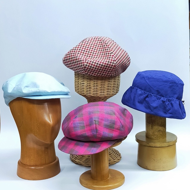 常設のクラスレッスンに参加して、教室の雰囲気も楽しみながら、好みのデザイン(裁断済の布キット使用)を選び、ワンレッスン2時間半から3時間で帽子を完成させ、被り方のアドバイスまで受けられる体験講座。画像のベレー帽、キャスケット、ハンチング、お散歩ハット(短めのつばのクロッシェ型)から1型選ぶ。体験講座の為型紙は含まない。定員各回2名。初心者歓迎。申込締切は開催日の7日前か定員満席にて。