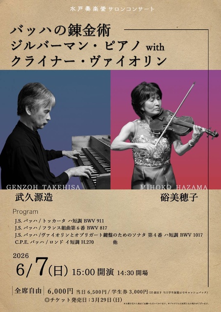 18世紀のジルバーマン・ピアノと19世紀のクライナー・バイオリンで、バッハの響きを愉しむ。ピアニスト武久源造氏とヴァイオリニスト硲美穂子氏の共演。