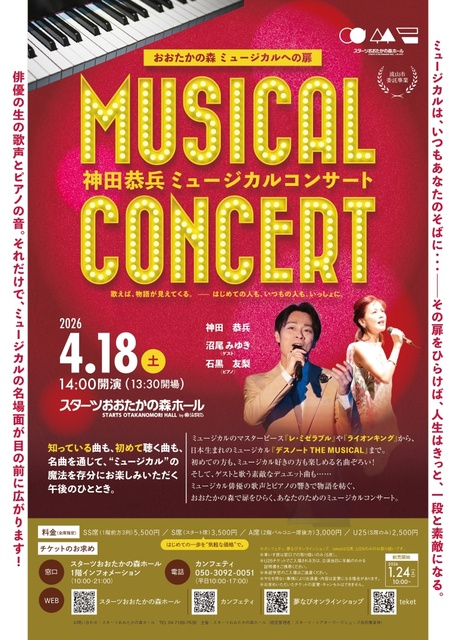 ミュージカルのマスターピース『レ・ミゼラブル』や『ライオンキング』から、日本生まれのミュージカル『デスノート THE MUSICAL』まで。初めての人も、ミュージカル好きの人も楽しめる名曲ぞろい!そして、ゲストと歌う素敵なデュエット曲も…ミュージカル俳優の歌声とピアノの響きで物語を紡ぐ、おおたかの森で扉をひらく、あなたのためのミュージカル・コンサート。