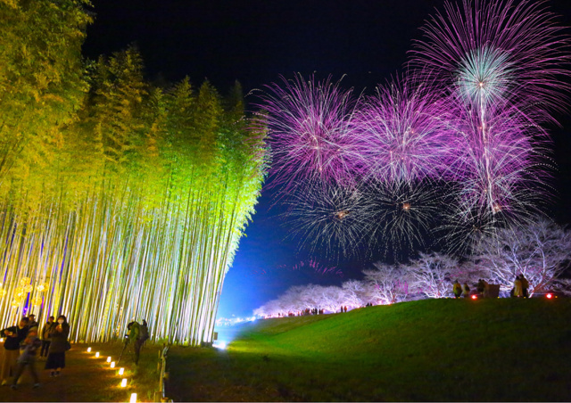 久慈川沿い、約1.3キロメートルの堤防に約130本の桜が咲き誇る景色は圧巻。菜の花との共演も美しく、ライトアップ期間中は美しい夜桜が見れれる。野村花火工業株式会社による花火大会のほか、昨年好評を得た竹あかりイベント「DRAGON BAMBOO」もパワーアップして開催。竹あかりの幻想的な光に包まれた竹林は壮観だ。