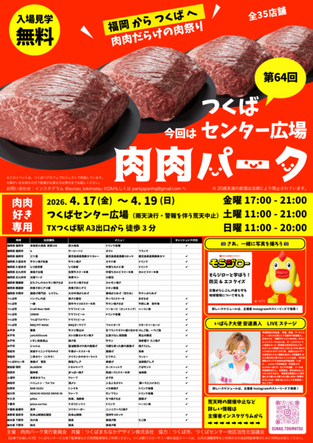 人気店、全35店舗、みんな大好き、お肉人気店が大集合!各店自慢のお肉料理を提供する。中には肉肉パーク限定メニューも。