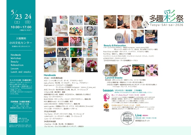 ハンドメイド作品販売、制作ワークショップ、リラグゼーション、フード・ドリンク、リコーダーのミニライブ、フィットネスまで。幅広いジャンルが出店する年に一度の大人の文化祭。今年21回目を迎える大人気イベント。各ブースが趣向を凝らした「彩」で来場者をお迎えする。制作ワークショップは子ども大歓迎。室内開催なので、天気の心配なく楽しめる。
