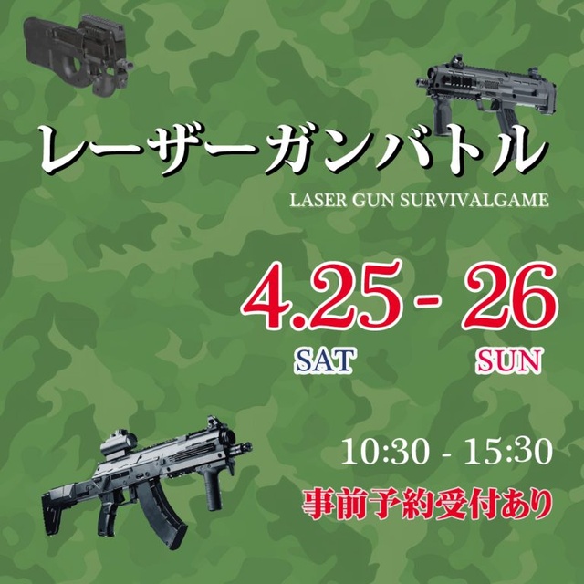 銃を打ち合う対戦型スポーツ “サバイバルゲーム” 通常はエアガンでBB弾を打つところを外国製の高性能レーザー銃とセンサーを装備! 狙って撃つだけなので、年齢・体力差に関係なく参加できる新感覚イベント! 爽快な非日常バトル空間を楽しもう。 ※参加は小学1年生以上から