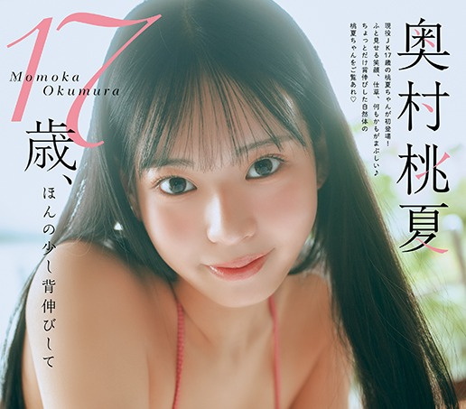 今春グラビアデビューしたばかりの“現役高校生”奥村桃夏が、28日発売の『ヤングアニマル』(白泉社)の巻末グラビアには初登場した。