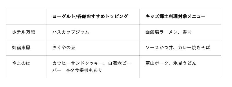 ビュッフェ会場ではお子さまのお食事時間が楽しめるメニューをご用意いたします。朝食ではヨーグルトのトッピングに各地ゆかりの味わいを追加し、お子さまが美味しく楽しく地域に触れていただける内容としました。また夕食では、スタッフがお子さまにも親しみやすいご当地食材や郷土料理をご紹介し、ご希望に応じてキッズサイズで提供いたします。郷土料理をより身近に、より深く楽しんでいただける機会を創出します。