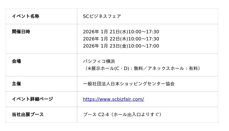 日本ショッピングセンター全国大会「SCビジネスフェア」は、SC関係者が一堂に会する唯一の商談展示会です。全国のSCディベロッパー企業(SCの開発、管理・運営者)、テナント企業(専門店)、サポート企業(内装、店舗企画、マーケティング、コンサルティングなど)、DX・テクノロジー系企業が出展します。■当社出展概要(ブース:C2-4)