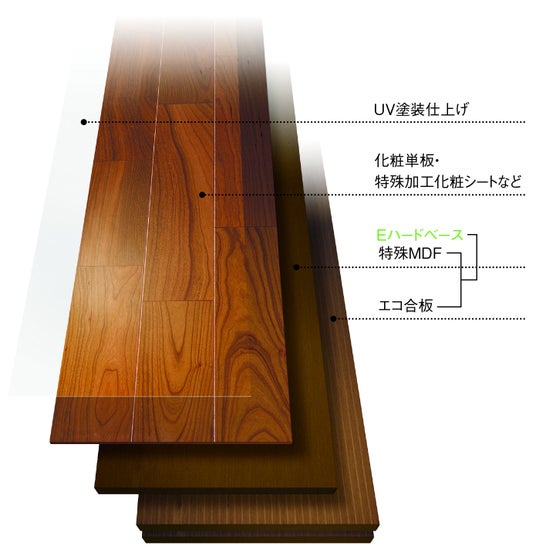 「Eハードベース」とは、表面の平滑性や耐水性など、床基材に求められる性能を有した特殊なMDF(中密度木質繊維板)に、植林木や適正に管理された森林から出材する木材を使用した合板を張り合わせた、当社独自のフロア用基材です。製材時に出る端材などからつくるMDFと、持続可能な木材からつくる合板で構成しているため、環境にやさしいエコ基材といえます。