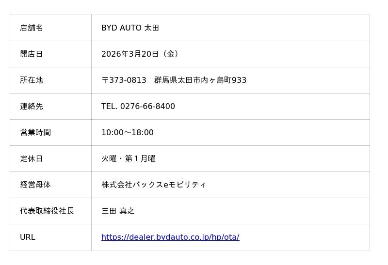 株式会社オートバックスセブン(代表取締役 社長:堀井勇吾、以下「当社」)の連結子会社(孫会社)である株式会社バックスeモビリティ(代表取締役社長:三田真之、以下「バックスeモビリティ」)は、BYD Auto Japan株式会社の正規ディーラーとして、「BYD AUTO 太田」を2026年3月20日(金)に新規オープンいたします。