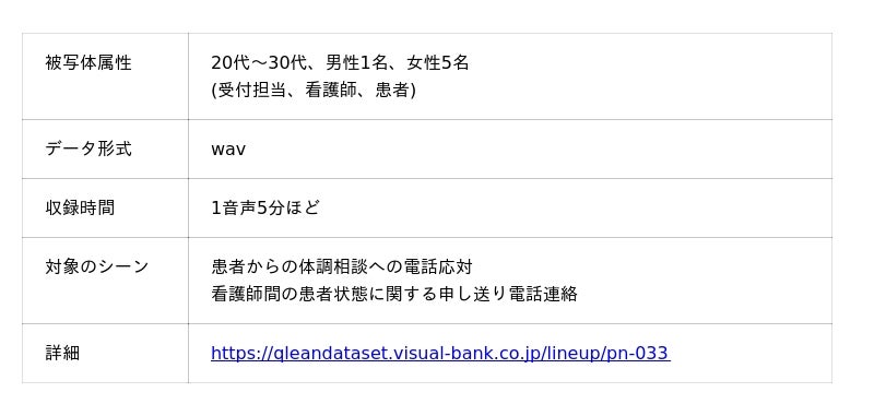 Visual Bank株式会社(東京都港区、代表取締役CEO 永井真之、以下「Visual Bank」)は、傘下の株式会社アマナイメージズを通じて展開するAI学習用データソリューション『Qlean Dataset(キュリンデータセット)』において、『日本語・2話者・医療現場の電話応対音声コーパスデータセット』の提供を開始しました。