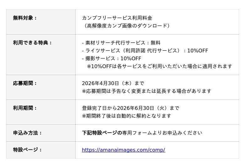 そこで、制作現場で活用いただいている「カンプフリーサービス*」に新たな特典を追加し、サービスをリニューアルいたしました。これを記念し、期間限定でカンプフリーサービスの利用料金を無料とするキャンペーンを実施いたします。