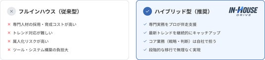 そこで、現実的な解決策として「自社で担うコア業務(戦略・判断)」と「外部の専門家を活用する業務」を切り分け、段階的に自走体制へと移行していく「ハイブリッド型」の体制が求められています。