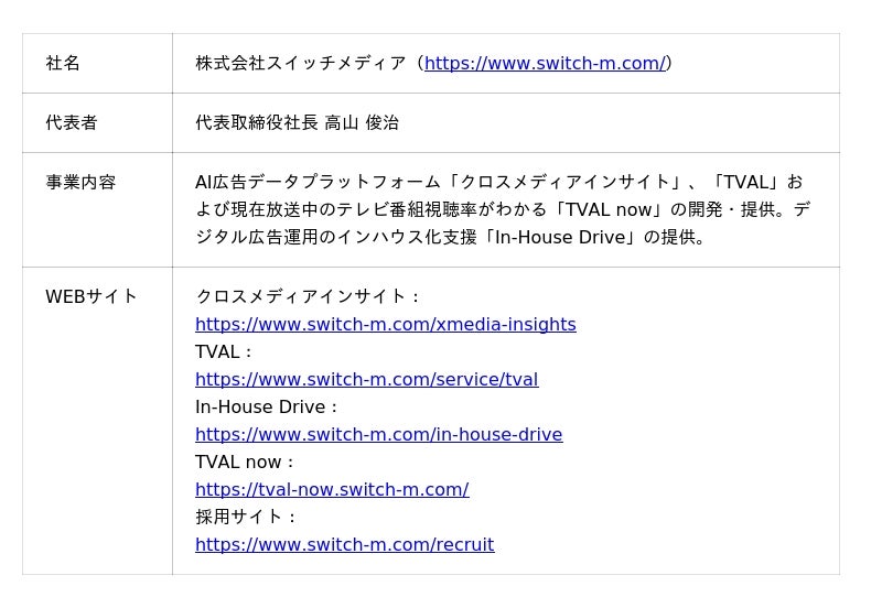 スイッチメディアについて株式会社スイッチメディアは、テレビCM+デジタル広告の出稿データを統一指標で一元管理し、過去比較やブランド横断分析を通じてメディア予算アロケーションを支援するAI広告データプラットフォーム「クロスメディアインサイト」の開発・運営、およびデジタル広告運用のインハウス化を支援する「In-House Drive」の提供、また国内最大規模のテレビ視聴パネルから取得したテレビCM接触データとインテージ社の購買データ(SCI(R))をシングルソースで連携させ、テレビCMの売上効果を分析する「TVAL」の開発・運営を行っています。