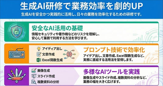 株式会社リスキルは、全従業員が最新のテクノロジーを安全かつ実践的に業務へ組み込むための「生成AI活用研修」の提供を開始しました。本研修は、生成AIの定義やハルシネーション、著作権といった「過信しない」ための注意点を深く理解し、情報セキュリティリスクを回避することを重視します。