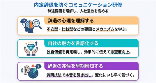 本研修は、内定辞退の要因を体系的に理解し、候補者の志望度を高める魅力付けと適切な面談技術を身に付けることが狙いです。