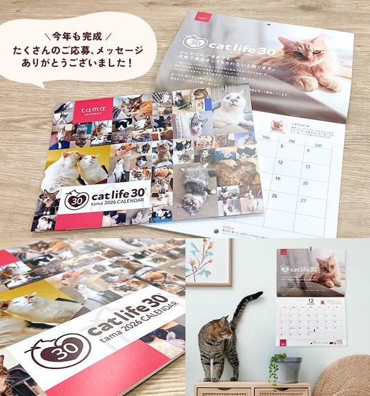 「tamaのオリジナルカレンダー2026」は、tama創業12周年を記念して、全国の皆さまから「ウチの子(猫)」のとびきりかわいく収まった写真を募集して作成したオリジナルカレンダーです。猫が30歳まで元気に長生きできることを考えたtamaの理念「cat life 30(R) 」についてや、一年を通して気をつけたい猫の健康にまつわるポイントも紹介しています。(サイズ:見開きA3)
