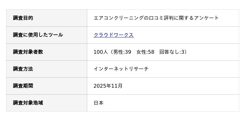 エアコンクリーニングの口コミ評判に関するアンケート調査の概要