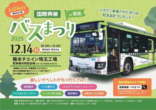 バス・ホテルなどの事業を展開する国際興業株式会社(本社:東京都中央区、社長:黒滝寛)は、12月14日(日)に「国際興業バスまつり2025in飯能」を開催いたします。会場は、株式会社椿本チエイン様のご協力により、飯能市内の「椿本チエイン 埼玉工場 駐車場内特設会場」での開催となります。