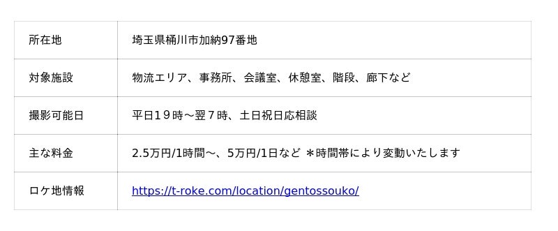 ロケ地提供サイト「Tロケ」を運営する東日印刷株式会社(本社:東京都江東区、社長:西川光昭、 以下TONICHI)は、日本でトップシェアを誇るLEDライトメーカー、ジェントス株式会社(本社:東京都台東区、社長:岡崎誠)の物流センター(埼玉県桶川市)を、ドラマやCMなどのロケ地として新たに登録、提供を開始しました。