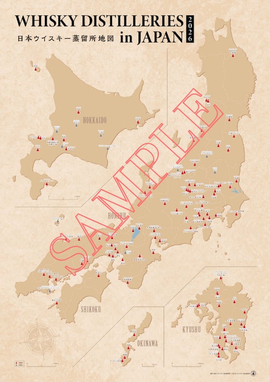 『ジャパニーズウイスキー蒸留所ポスター2026』2025年10月時点の稼働中、準備中の日本のウイスキー蒸留所(114ヵ所)を1枚の地図にまとめたポスターです。インテリアにはもちろん、ウイスキーコニサー試験やウイスキー検定の勉強にもご活用いただけます。