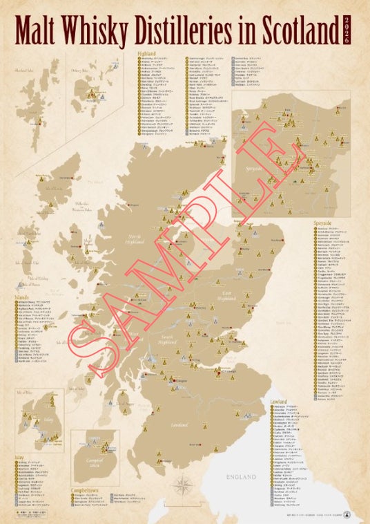 『スコッチウイスキー蒸留所ポスター2026』2025年11月時点の稼働中、準備中のスコットランドのモルトウイスキー蒸留所(196ヵ所)を1枚の地図にまとめたポスターです。昨年度版より掲載数は15ヵ所増えております。インテリアにはもちろん、ウイスキーコニサー試験やウイスキー検定の勉強にもご活用いただけます。