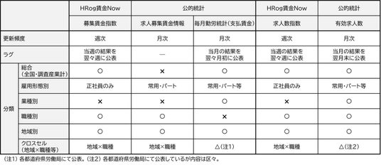 <労働市場に関する公的統計と「HRog賃金Now」との比較対照表>