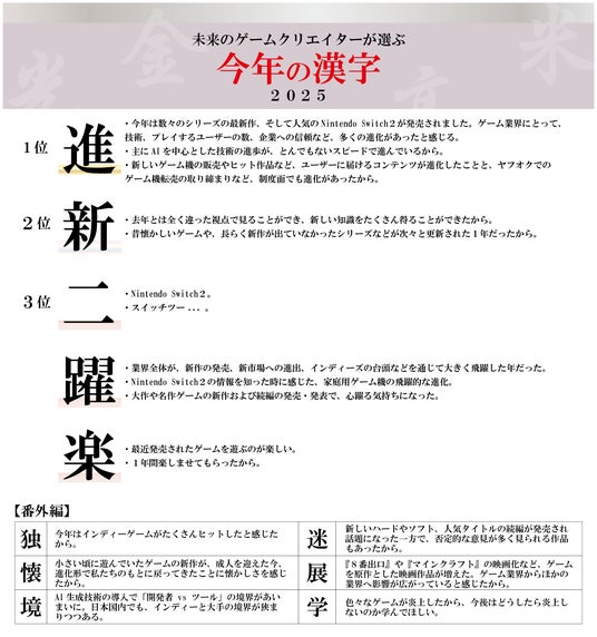 ゲーム業界「今年の漢字」は【進】!印象に残ったニュース第1位は…。未来のゲームクリエーターが選ぶゲーム大賞2025【東京クールジャパン・アカデミー】