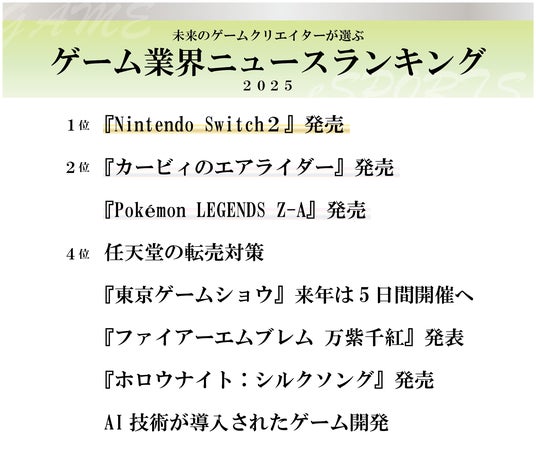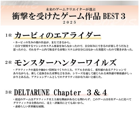 調査対象は、ライター、プランナー、プログラマー、2D/3Dデザイナー、サウンドデザイナー、プロゲーマー、ストリーマーなど、将来ゲーム業界での活躍を目指す学生です。本調査では、2025年のゲーム業界で印象に残ったニュースや衝撃を受けた作品、ならびに「2025年のゲーム業界を表す漢字」について回答を収集しました。