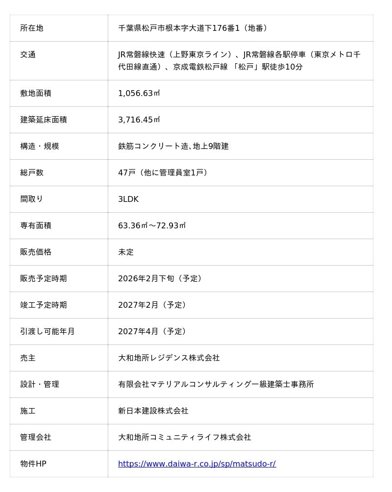 大和地所レジデンス株式会社(東京都港区、代表取締役社長:下村俊二)は、千葉県松戸市において、新築分譲マンション「ヴェレーナ松戸レジデンス」のマンションギャラリーを2026年1月10日(土)よりオープンすることをお知らせいたします。