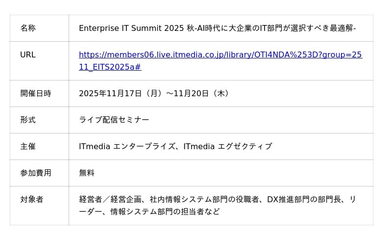 アイティメディア株式会社(本社:東京都千代田区、代表取締役社長 兼 CEO:小林教至、以下アイティメディア)は、2025年11月17日(月)~11月20日(木)に「Enterprise IT Summit 2025 秋」を開催します。本イベントは、「ITmedia エンタープライズ」「ITmedia エグゼクティブ」主催のデジタルイベントで、経営層や情報システム部門などの読者に向けて、「大企業のIT部門が選択すべきAI時代の最適解」について6つのテーマで実施します。