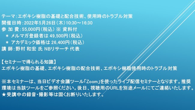 先端技術情報や市場情報を提供している(株)シーエムシー・リサーチ(千代田区神田錦町: https://cmcre.com/ )では、 各種材料・化学品などの市場動向・技術動向のセミナーや書籍発行を行っておりますが、 このたび「エポキシ樹脂の基礎と配合技術、使用時のトラブル対策」と題するセミナーを、 講師に野村 和宏 氏 NBリサーチ 代表)をお迎えし、2022年5月26日(木)10:30より、 ZOOMを利用したライブ配信で開催いたします。 受講料は、 一般:55,000円(税込)、 弊社メルマガ会員:49,500円(税込)、 アカデミック価格は26,400円(税込)となっております(資料付)。 セミナーの詳細とお申し込みは、 弊社の以下URLをご覧ください! https://cmcre.com/archives/95147/ 質疑応答の時間もございますので、 是非奮ってご参加ください。