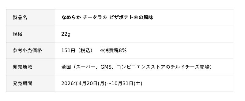 そこで今回は、大人から子どもまで幅広い世代に愛される「ピザポテト(R)」の風味を取り入れることで、「なめらか チータラ(R)」をおやつやおつまみの枠を超えて楽しんでいただきたいと考えました。「チータラ(R)」と「ピザポテト(R)」が織りなすコラボレーションを通じて、食べるたびにワクワクするひとときをお届けします。