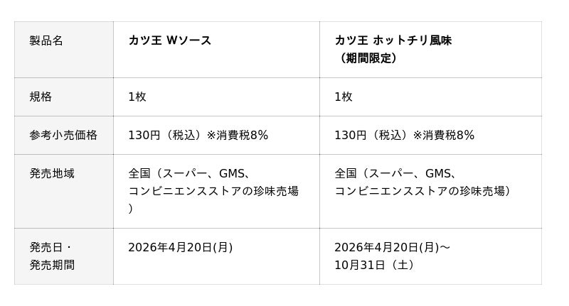 株式会社なとり(本社:東京都北区 会長兼社長:名取三郎)は、「カツ王 Wソース」「カツ王 ホットチリ風味(期間限定)」を4月20日(月)より新たに発売いたします。