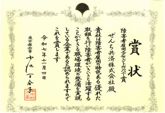障害者向けの保険を取り扱う専門保険会社、ぜんち共済株式会社(本社:東京都千代田区、代表取締役社長:榎本重秋)は、令和7年度「障害者雇用エクセレントカンパニー賞」にて東京都知事賞を授与されました。