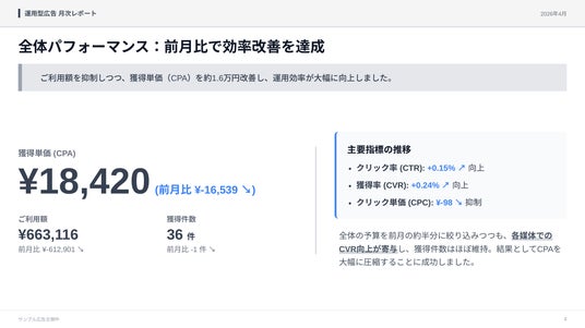 2つ目は「月次レポートスライド」です。クライアントを対象に、広告運用の成果をグラフ・数値で報告するスライドを生成できるサンプルです。毎月、全クライアント分のレポートスライドを作成する必要があるものの、クライアント数が増えるほどレポーティング作業に時間が取られ、施策改善に集中しにくくなるという課題に対応しており、広告運用レポートPDFやリサーチデータを素材として投入するだけで、成果が可視化された月次レポートスライドを効率的に作成することが可能です。レポーティング業務の負担を軽減し、施策の分析や改善提案により多くの時間を確保できます。