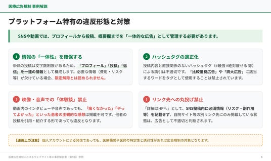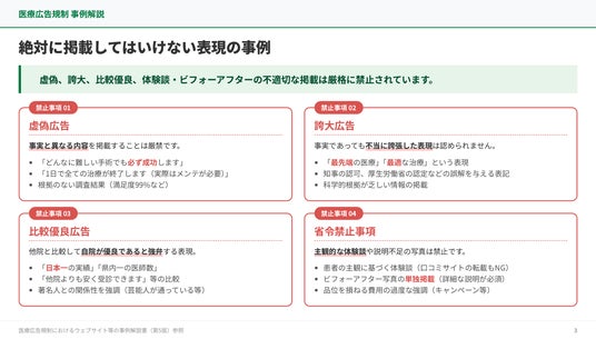 3つ目は「広告ルール変更のクライアント説明スライド」です。クライアント(広告主)を対象に、公的文書の変更点を出典付きでわかりやすく説明するスライドを生成できるサンプルです。広告規制や業界ルールの変更があるたびに全クライアント向けに説明資料を準備する必要があるものの、公的文書から要点を抽出してスライドにまとめ直す作業に手間がかかるという課題に対応しており、公的文書PDFを素材として投入するだけで、変更点が整理された説明スライドを短時間で作成することが可能です。広告規制・業界ルールの変更時に、全クライアントへ迅速かつ正確に情報を届ける体制を構築できます。