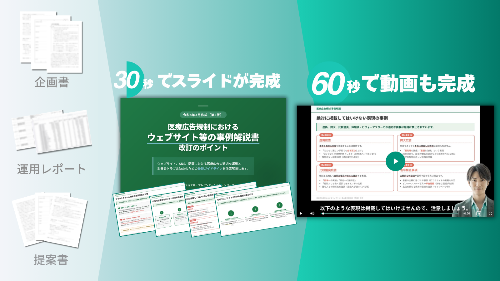 オリエンシートや運用レポートなどの既存PDFを投入するだけで、提案スライドからナレーション付き動画までを一気通貫で自動生成