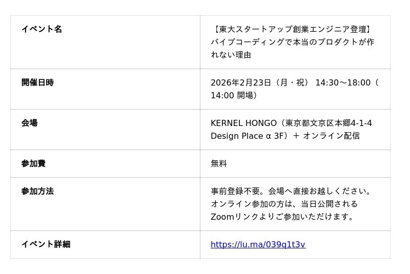 日本発の動画生成AIプロダクト「NoLang」を開発する株式会社Mavericks(本社:東京都文京区、代表者:Founder CEO 奥野 将太)は、2026年2月23日(月・祝)に、AI時代のプロダクト開発の実態と必要な知見をテーマとした登壇イベント「バイブコーディングで本当のプロダクトが作れない理由」をKERNEL HONGO(東京都文京区)およびオンラインで開催いたします。参加費は無料、事前登録不要です。