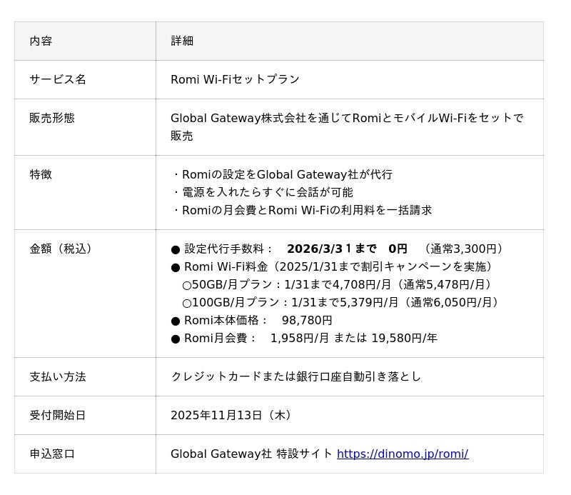 2025年11月13日(木)Global Gateway株式会社(本社:東京都千代田区、代表取締役:比嘉 良放、以下弊社)は、株式会社MIXI(本社:東京都渋谷区、代表取締役社長 上級執行役員 CEO:木村弘毅)の会話AIロボット「Romi(ロミィ)」と、当社のモバイル回線サービス「Romi Wi-Fi」をワンボックスでお届けするセット販売を本日開始します。