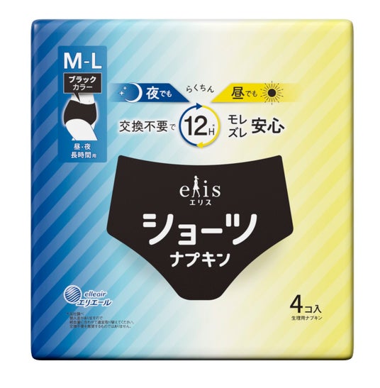 「ナプキン」と「ショーツ」が一体になった生理用ショーツ型ナプキン「エリスショーツ」は、当社の夜用ナプキンと比較して吸収量3枚分、12時間交換不要の吸収力と、スタイリッシュなブラックカラーが特長です。吸収体のごわごわ感を軽減し下着のようなはき心地をめざした厚さ2.9mmの“超うす型設計”を採用。日常からスポーツ、就寝時など、さまざまなシーンでのご使用におすすめです。