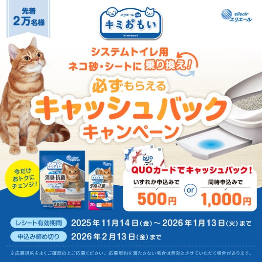 大王製紙株式会社(本社:東京都千代田区)が展開する衛生用紙製品No.1ブランド※2「エリエール」のペット用品ブランド「エリエールPet キミおもい」は、「キミおもい パワフル消臭・抗菌 システムトイレ用ネコ砂」および「キミおもい パワフル消臭・抗菌 システムトイレ用シート」に乗り換えた方を対象に、先着2万名さまにQUOカード最大1,000円分をキャッシュバックする「エリエールPet キミおもい システムトイレ用ネコ砂・シートへ乗り換え!必ずもらえるキャッシュバックキャンペーン」を、2025年11月14日(金)~2026年1月13日(火)まで実施します。
