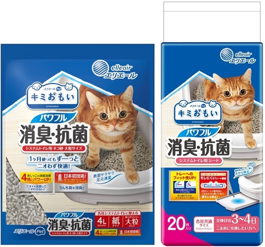 「エリエールPet キミおもい」は、ペットオーナーの方が抱えるニオイの悩みを解決するため、2025年4月に日本初の技術※3を採用し、消臭効果4倍※4と1カ月継続する消臭効果を実現した「キミおもい パワフル消臭・抗菌 システムトイレ用ネコ砂」を発売。また、ネコちゃん特有のトイレ臭を元から除去する消臭成分を配合し、各社のシステムトイレで使える「キミおもい パワフル消臭・抗菌 システムトイレ用シート」も併せて発売しました。