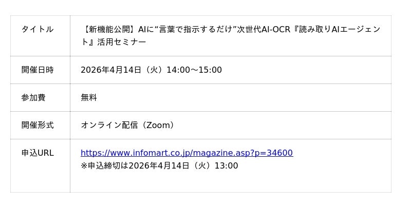 本機能の搭載に伴い、デモを用いた活用セミナーを2026年4月14日(火)に開催します。複雑な発注書を柔軟に読み取り、工数や処理時間を大幅に削減できる次世代AI-OCRの仕組みをぜひ体感してください。