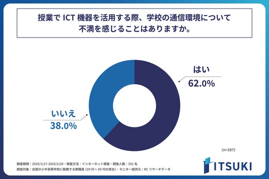 また、授業でICT機器を使用すると回答された方に「授業でICT機器を活用する際、学校の通信環境について不満を感じることはあるか」を問う設問への回答では、「はい」が62.0%、「いいえ」が38.0%という結果になりました。この結果から、授業でICT機器を使用する小中高等学校の教職員の6割以上が、学校の通信環境について不満を感じていることがわかりました。